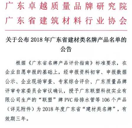 12月19日,广东卓越质量品牌研究院与广东省建材行业协会联合发布《关于公布2018年广东省建材类名牌产品名单的公告》,根据《广东省名牌产品评价指南》标准要求,在企业自愿申报的基础上,经申报资料初审、申报数据公示、企业现场审查、专家综合评价、广东质量品牌评审专家委员会审议确认,授予广东联塑科技实业有限公司生产的 “联塑”牌PVC给排水管等106个产品为2018年度广东省建材类名牌,有效期三年。