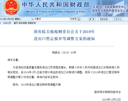 财政部:国务院关税税则委员会关于2019年进出口暂定税率等调整方案的通知发布