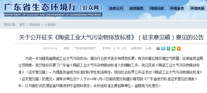 近日,广东省生态环境厅为进一步加强广东省陶瓷工业大气污染防治,推动行业技术进步和绿色发展,有效改善区域环境空气质量,经原省质监局立项同意,本厅组织开展了广东省《陶瓷工业大气污染物排放标准》的编制工作,现已完成《陶瓷工业大气污染物排放标准》(征求意见稿)。