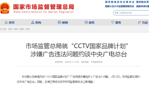 1月17日,国家市场监管总局网站针对群众反映强烈的“CCTV国家品牌计划”广告用语涉嫌违反《广告法》问题,1月17日,市场监管总局约谈中央广电总台。目前,总局已责成北京市市场监管局依法立案调查。