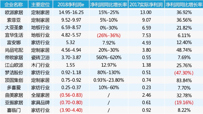 近日,多家上市公司公布了2018年度业绩公告。截至2月11日,已有14家家居上市公司公布了相关数据,多数企业仅公布了2018年预计的净利润总额,经亿欧家居摘录,如下图所示: