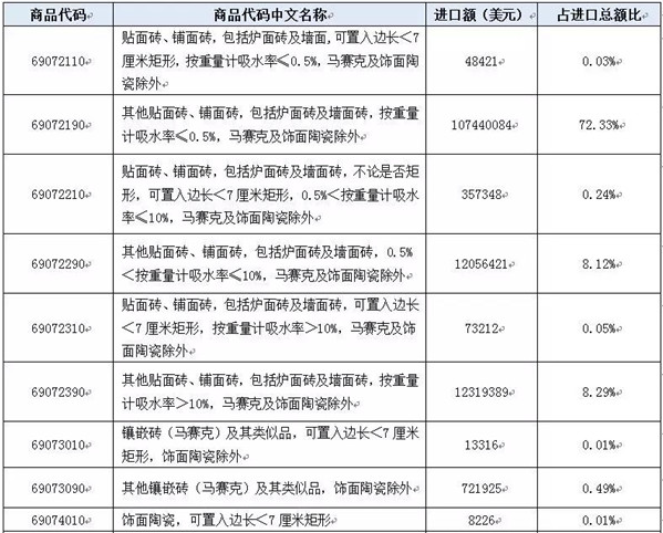 2018年瓷砖进口1.49亿美元,同比增长17.74%