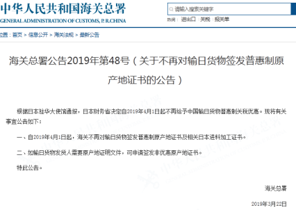 4月1日起日本财务省决定不再给予中国输日货物普惠制关税优惠。这意味着中国原产地货物进入日本将不再享受特惠关税待遇。海关总署近日发布消息称,自2019年4月1日起停止对日签发普惠制原产地证书及相关的日本进料加工证明。输日货物需原产地证明文件的,可依申请签发非优惠原产地证书。