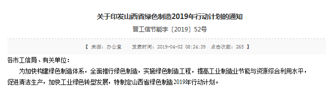 近日,山西省工信厅公布了《山西省绿色制造2019年行动计划》,山西将培育发展绿色设计产品、绿色工厂、绿色园区和绿色供应链,完善绿色制造体系,全省工业绿色化程度稳步提高。