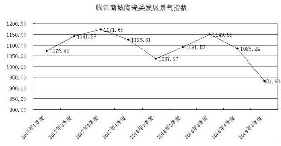 2019年一季度,山东临沂商城陶瓷类发展景气指数收于931.90点,同比下滑91.96点,跌幅7.17%;环比下滑153.34点,跌幅14.13%。