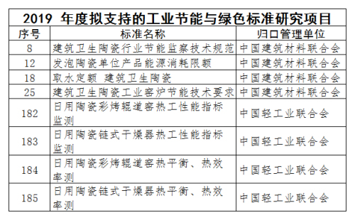 日前,工信部公示2019年度工业节能与绿色标准研究项目,项目共计229项。其中涉及建筑陶瓷与日用陶瓷的多个方面标准,项目数量共8项。