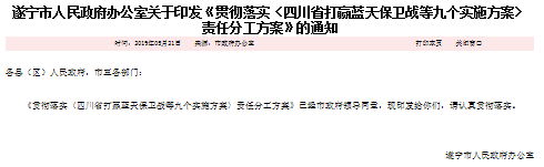 近日,四川遂宁人民政府办公室印发《贯彻落实〈四川省打赢蓝天保卫战等九个实施方案〉责任分工方案》的通知(以下简称:《通知》)。