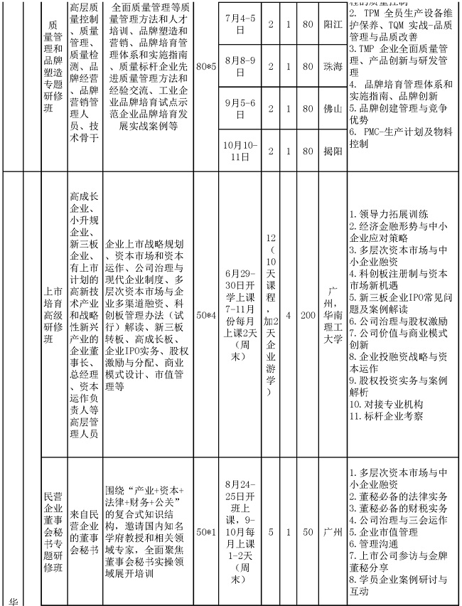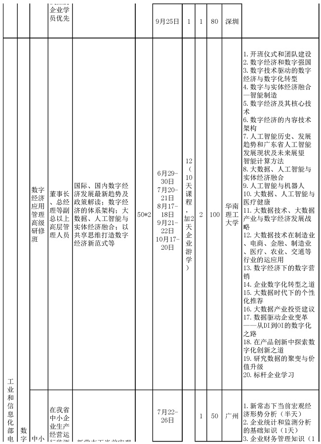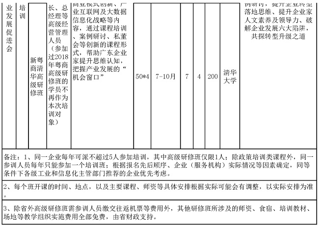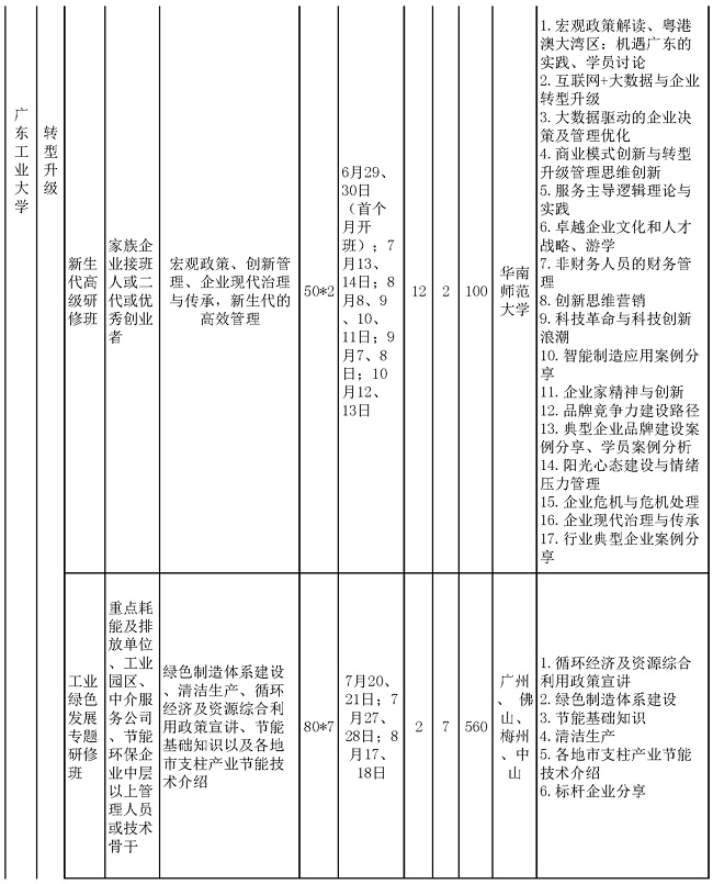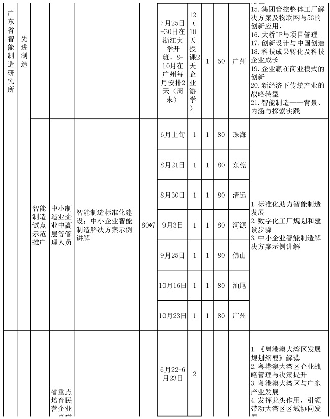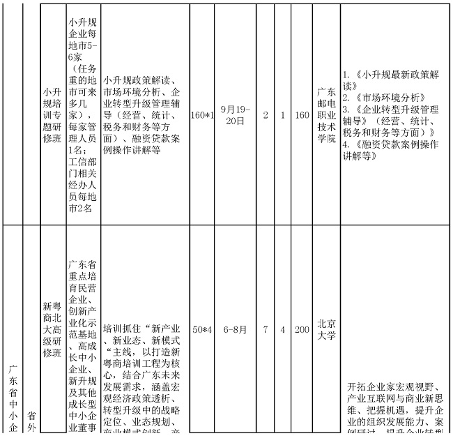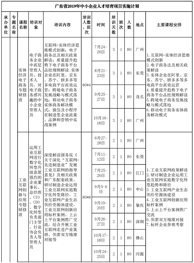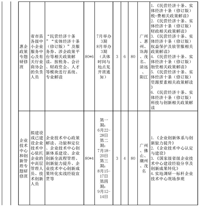 为贯彻落实《广东省委办公厅、省政府办公厅关于促进民营经济高质量发展的若干政策措施》的精神,充分发挥财政资金引导作用,推动提升我省中小微企业经营管理人员、服务机构的综合素质,我厅通过公开招投标方式,围绕互联网+、数字经济、转型升级、先进制造、大湾区发展、精益生产、投融资、服务能力提升、传承与创新、省外培训等10个专题,确定中国电器科学研究院股份有限公司、工业和信息化部电子第五研究所、广东工业大学、省智能制造研究所、中山大学、暨南大学、华南理工大学、华南师范大学、广东邮电职业技术学院、省中小企业发展促进会等10个承办单位,免费对全省1.2万人次以上中小(民营)企业、服务机构中高层经营管理人员开展培训。
