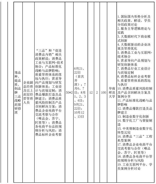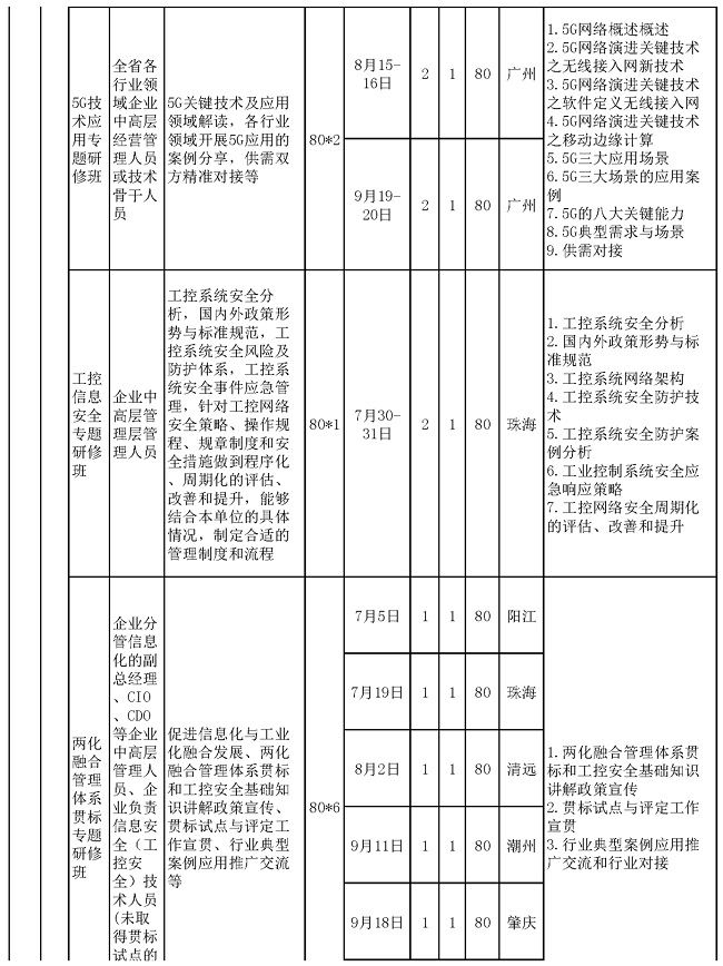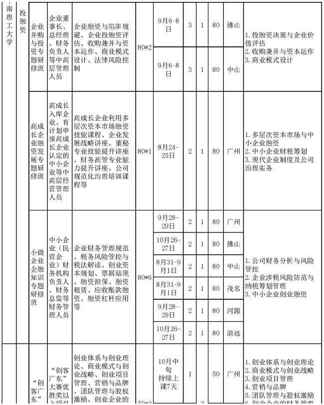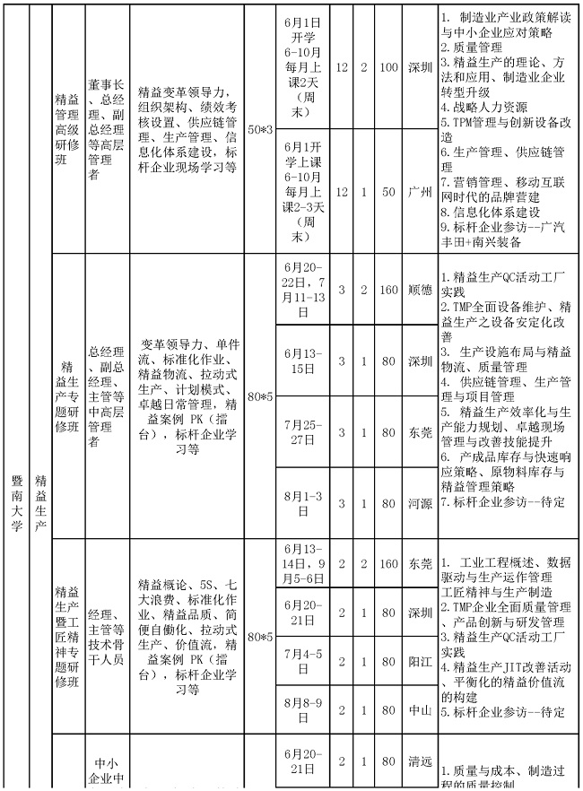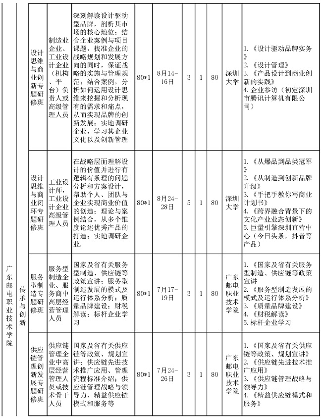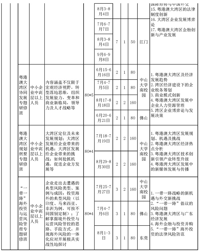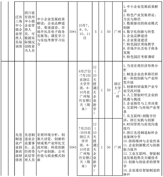 为贯彻落实《广东省委办公厅、省政府办公厅关于促进民营经济高质量发展的若干政策措施》的精神,充分发挥财政资金引导作用,推动提升我省中小微企业经营管理人员、服务机构的综合素质,我厅通过公开招投标方式,围绕互联网+、数字经济、转型升级、先进制造、大湾区发展、精益生产、投融资、服务能力提升、传承与创新、省外培训等10个专题,确定中国电器科学研究院股份有限公司、工业和信息化部电子第五研究所、广东工业大学、省智能制造研究所、中山大学、暨南大学、华南理工大学、华南师范大学、广东邮电职业技术学院、省中小企业发展促进会等10个承办单位,免费对全省1.2万人次以上中小(民营)企业、服务机构中高层经营管理人员开展培训。