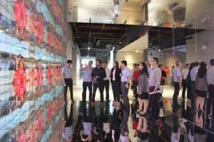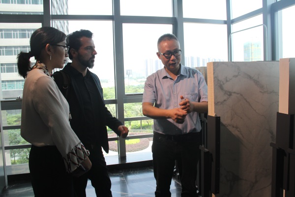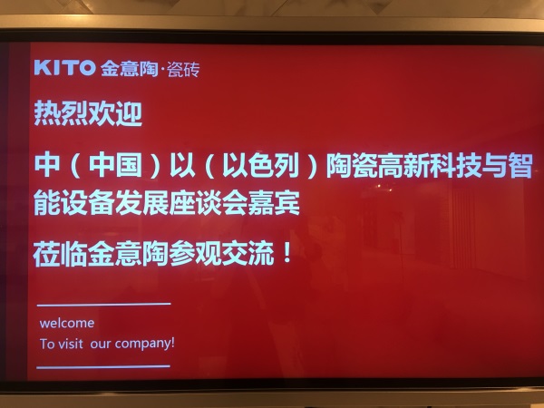 活动当天,由霸王集团创始人/小小世界集团主席万玉华Eva女士、资深融资策划人/金融总经理陈渭海Wilson先生、项目经理李思慧Krysta女士、COO(首席运营官)/中国区总经理&创新技术专家伊泰Gantz先生、商务拓展(中国区)黄少妍Sireen女士共同组成的以色列技术团队,以及东鹏技术研发相关负责人邝志均先生、金意陶技术研发总经理李德英先生、罗曼蒂克技术研发总经理黎炳华先生、芬芳陶瓷董事长/禅城陶协会长胡大为博士、新一派技术研发负责人朱彦秋先生、大鸿制釉技术顾问冯平先生6家本地代表性陶瓷企业技术研发负责人,在禅城陶协秘书长的陪同下首先参观了金意陶总部一、二、三楼展厅,大家对金意陶顺应国家倡导绿色环保理念所创新推出的“绿能”发泡陶瓷、全瓷家居样板间、发热瓷砖等企业重点产品给予极高评价。其中金意陶展厅按照不同主题、风格进行配套设计的布局更让人耳目一新,尤其是多面镜与LED组合而成的视频演示厅深受大家好评。