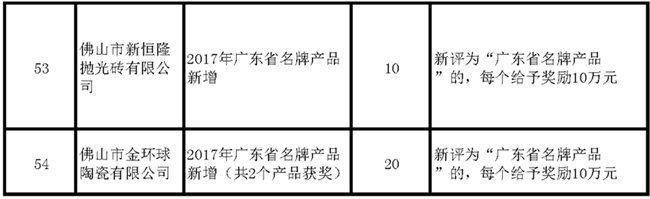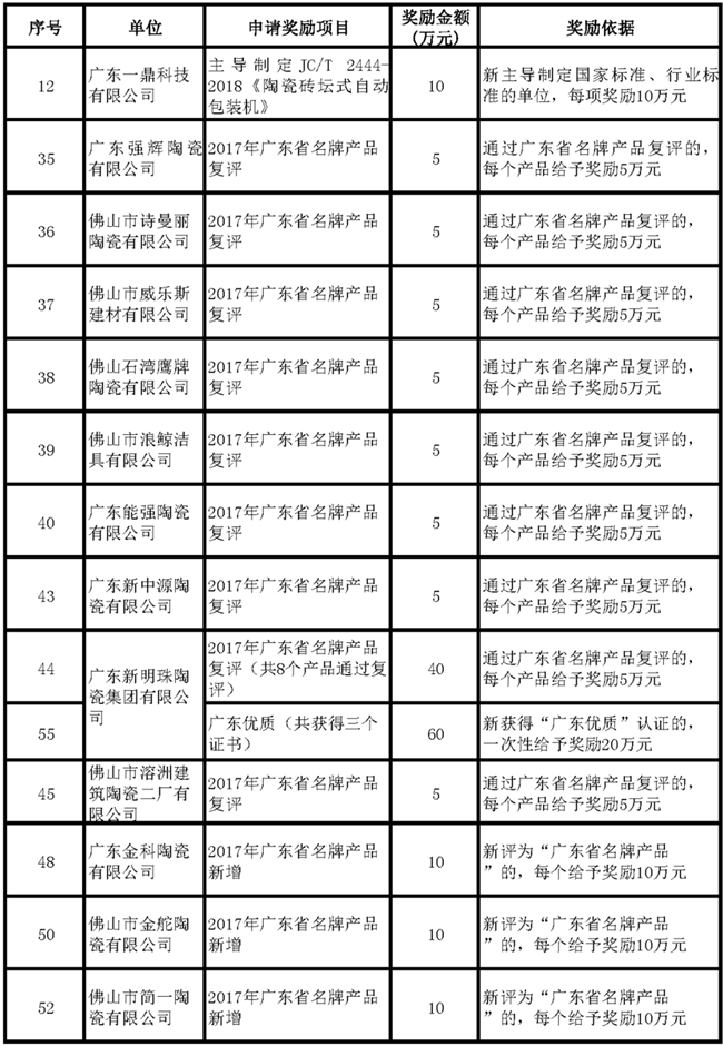 6月6日,禅城区市场监督管理局发布2018年佛山市禅城区推进品牌和技术标准战略拟扶持奖励项目(第二批),公示时间为2019年6月6日至2019年6月15日,奖励金总计491万。其中获得扶持奖励项目的陶瓷企业14家,卫浴企业1家,所获奖励金额合计210万。