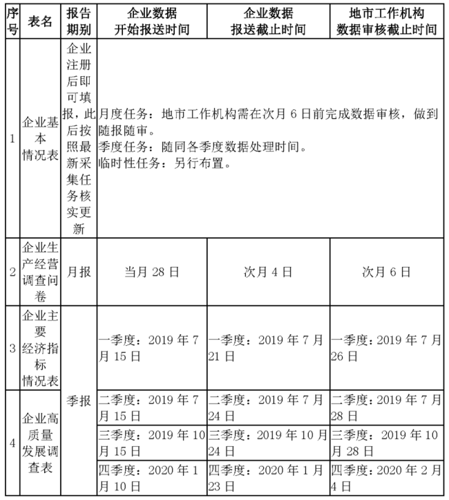 采集任务分为月度、季度和临时性任务。月度任务主要采集内容为企业生产、订单、库存、收入、用工及预期等情况,通过《企业生产经营调查问卷》采集。季度任务主要采集内容为企业主要财务指标、主要生产情况、资源使用情况,以及信息化、创新驱动、质量、绿色制造、开放共享、投融资等方面情况,通过《企业主要经济指标情况表》《企业高质量发展调查表》采集,其中《企业高质量发展调查表》内容在不同报告期适当分配。临时性任务的采集内容另行布置。